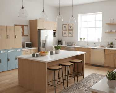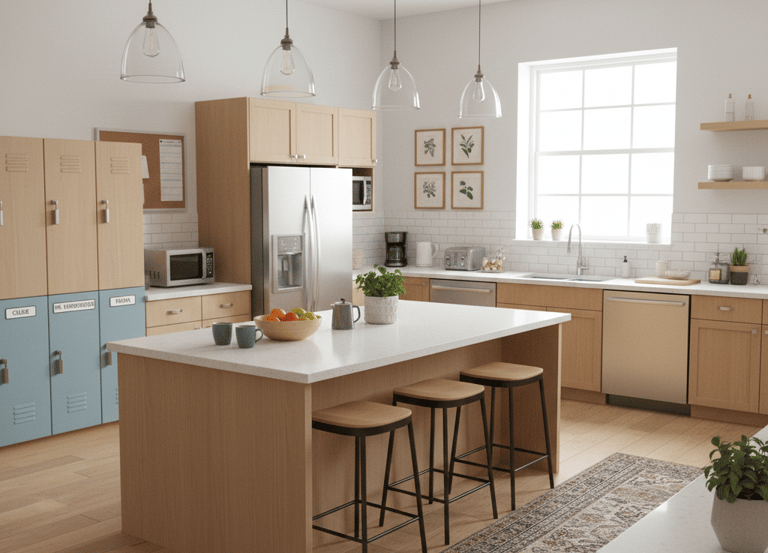 A clean, organized kitchen and dining space where residents can prepare meals, eat together and experience a sense of home.